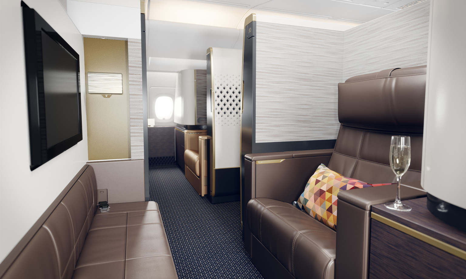 The First Apartments are an un-compromised passenger environment which challenge the status quo of the First Class sector. Re-setting the industry benchmark with room-like proportions and real cabinetry furniture. First to market with a separate sofa-seat and dedicated divan-style convertible ottoman-bed, a truly dynamic environment with freedom to move around more akin to a boutique hotel suite.