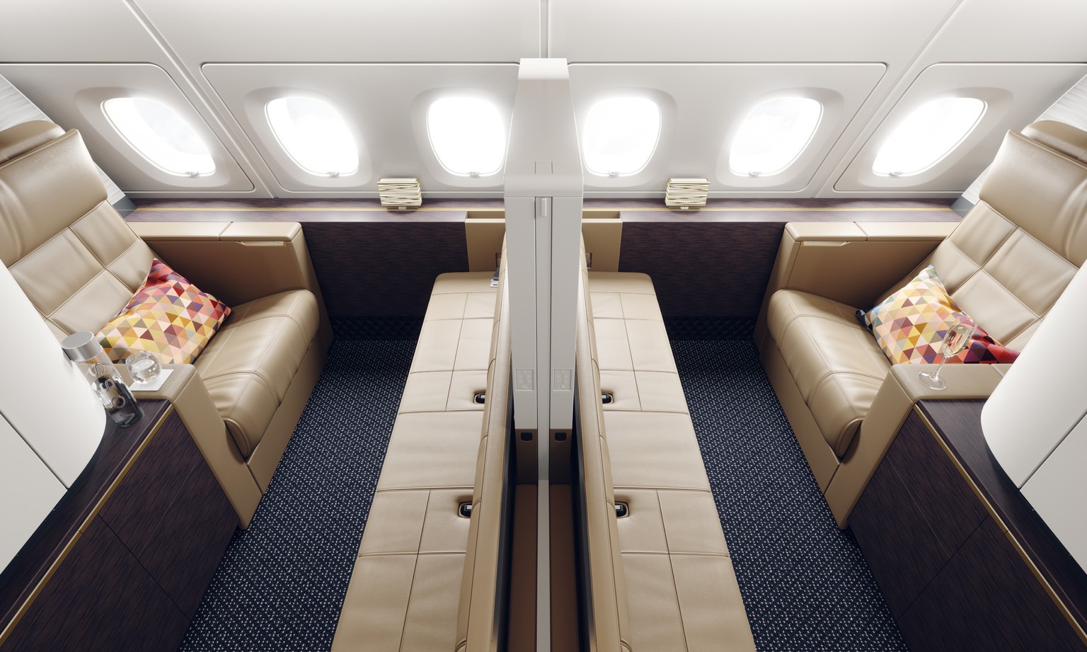 A passenger offer to rival many airlines’ First Class seats. Interlocking forward and aft facing ottomans provide a super-efficient passenger layout and vast table surfaces for each guest.